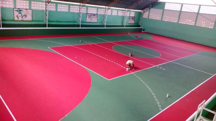 A primeira etapa, em relação ao projeto de recuperação total do Ginásio, está em fase conclusiva. O piso da quadra de jogo foi totalmente recuperado, ganhando nova pintura(foto); as duas arquibancadas e paredes internas receberam reparos e pinturas; as traves foram pintadas de acordo com as normas esportivas; a iluminação sofreu mudanças, para melhor. “Segunda ou terá-feira os trabalhos no ginásio serão paralisados, temporariamente, até que se conclua a pintura da Escola Municipal Manoel Delmiro Ferreira”, disse Didi Francisco.