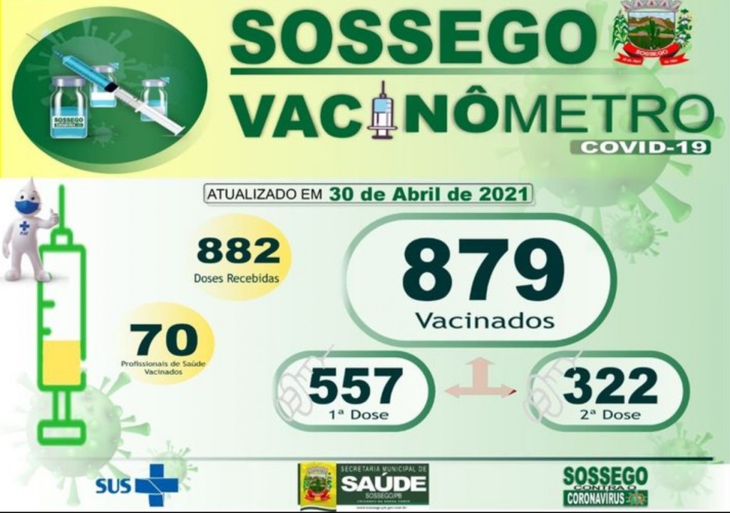 A secretaria Municipal de Saúde, juntamente com a equipe de imunização, tem se empenhado a cada dia, realizando uma campanha de vacinação de modo a contemplar todos os usuários pertencentes a cada grupo prioritário, conforme os repasses da Secretaria estadual de Saúde. Nosso vacinômetro está quase finalizando o grupo de idosos com idade acima de 60 anos, bem como os profissionais de saúde, atuantes nos setores da saúde do município. Salientamos novamente que, se vocês faz parte do grupo prioritário e ainda não foi vacinado, procure a equipe de saúde para mais informações.