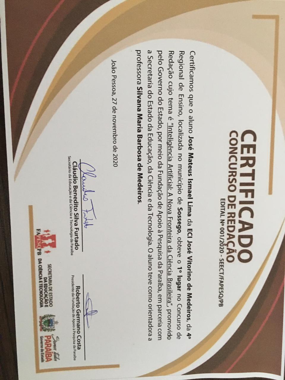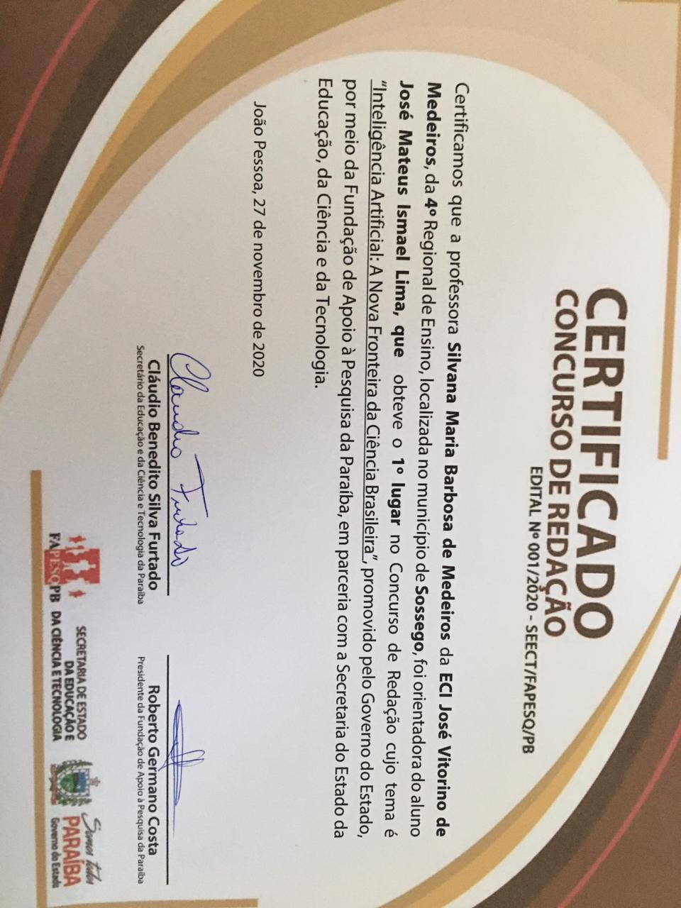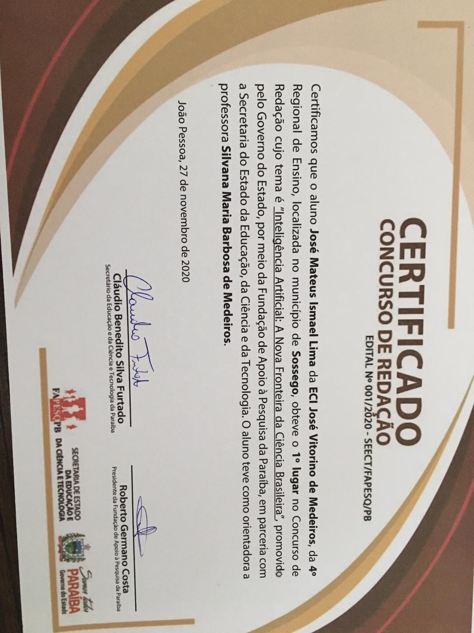 Os alunos José Mateus Ismael de Lima da ECI José Vitorino de Medeiros, da 4ª Região de Ensino, localizada no Município de Sossêgo-PB, a 228 Km de sua Capital, João Pessoa e David Naamã Melo de Figueiredo da EEEM Matildes de Melo Buriti, também da 4ª Região de Ensino, localizada no Municipio de Pedra Lavrada, foram homenageados por obterem o 1º lugar no concurso de redação cujo tema foi “Inteligência Artificial: A Nova Fronteira do Ensino Brasileiro”, promovido pelo governo do Estado, por meio da Fundação de Apoio a Pesquisa da Paraíba em parceria com a Secretaria de Estado da Educação e da Tecnologia.
