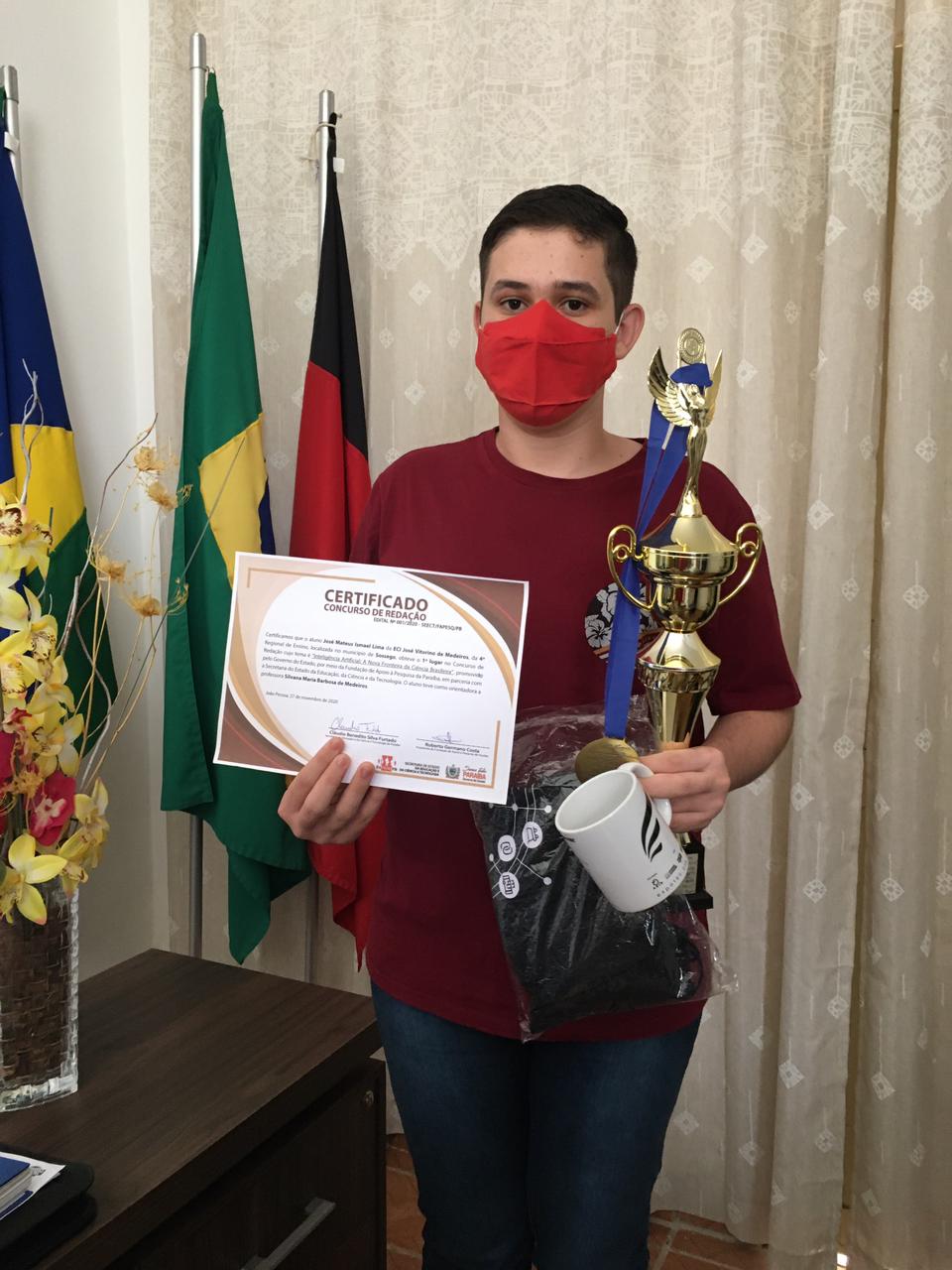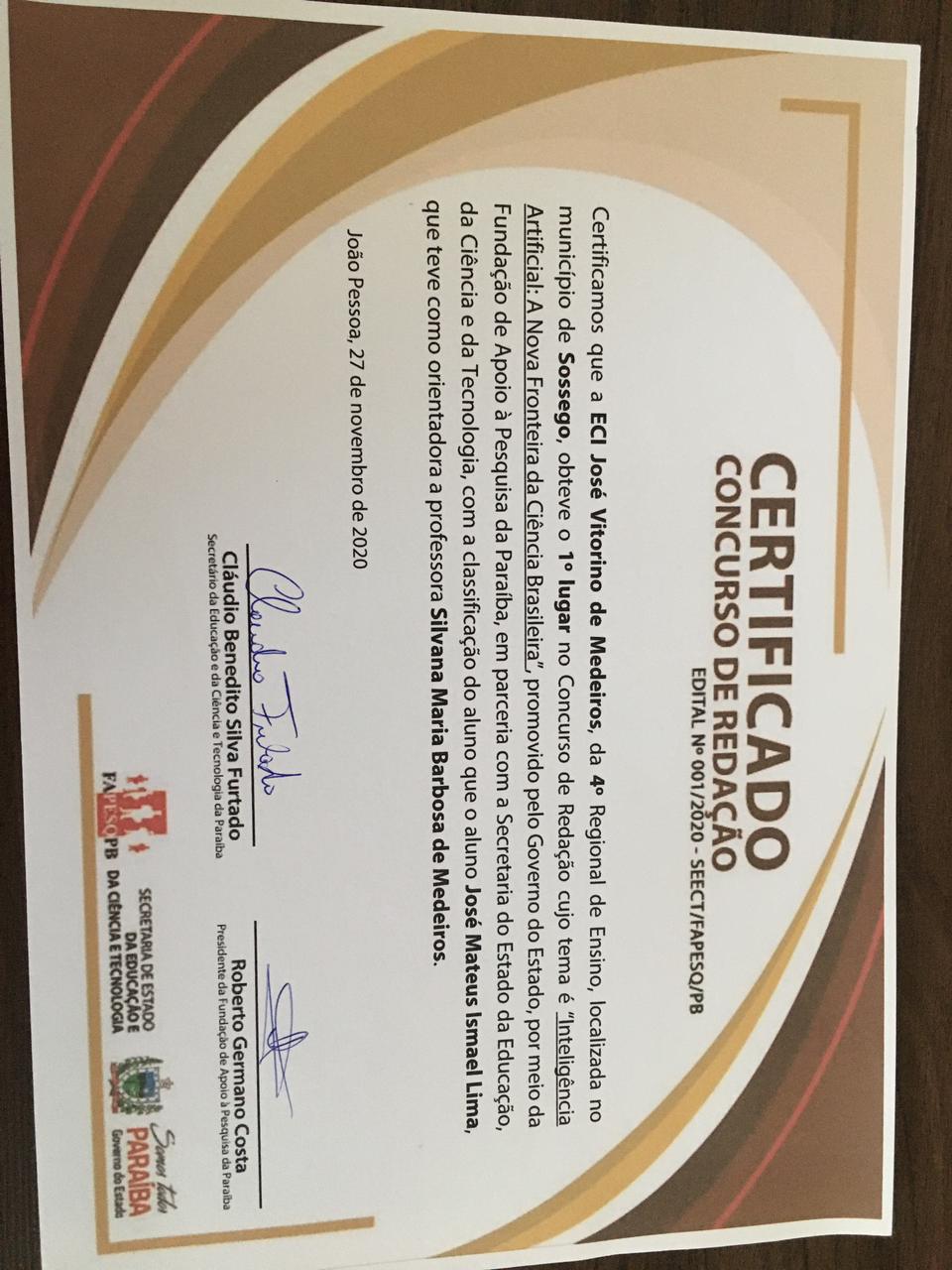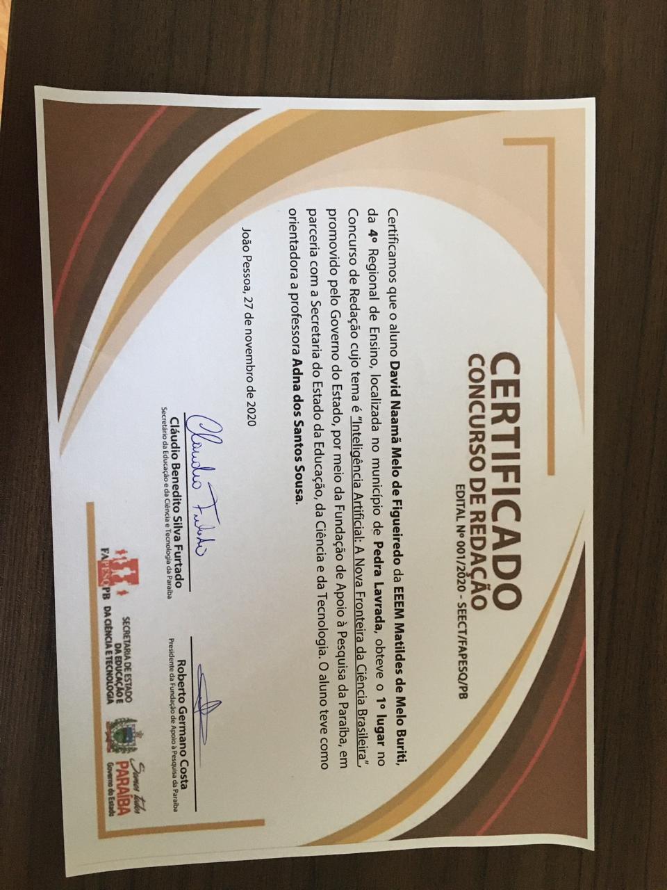 Os alunos José Mateus Ismael de Lima da ECI José Vitorino de Medeiros, da 4ª Região de Ensino, localizada no Município de Sossêgo-PB, a 228 Km de sua Capital, João Pessoa e David Naamã Melo de Figueiredo da EEEM Matildes de Melo Buriti, também da 4ª Região de Ensino, localizada no Municipio de Pedra Lavrada, foram homenageados por obterem o 1º lugar no concurso de redação cujo tema foi “Inteligência Artificial: A Nova Fronteira do Ensino Brasileiro”, promovido pelo governo do Estado, por meio da Fundação de Apoio a Pesquisa da Paraíba em parceria com a Secretaria de Estado da Educação e da Tecnologia.