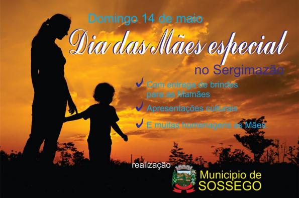 A Prefeitura Municipal de Sossego prestando relevantes serviços sociais a população, e dando total apoio a Secretaria de Ação Social, promove neste domingo, a partir das 3 horas da tarde, no Ginásio de Esportes “Sergimarzão” a grande festa do Dia das Mães 2017 com apresentações infantis, evoluções da Banda Fanfarra Famas e sorteios de brindes com as mães presentes. A prefeita Lusineide Oliveira, que tem prestado total apoio as iniciativas sociais, garante atenção e confraternização as Mães sosseguenses.