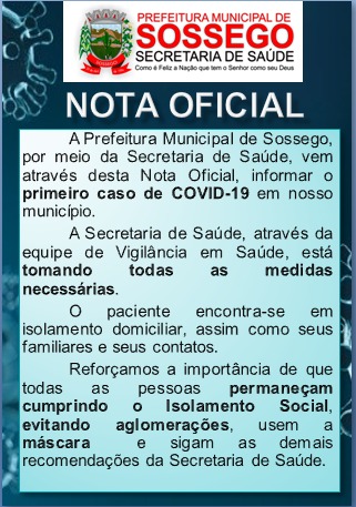 A Prefeitura Municipal de Sossego, por meio da Secretaria Municipal de Saúde, vem através desta Nota Oficial, informar o primeiro caso de COVID-19 em nosso município.