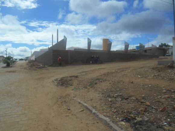 e máquinas trabalham diuturnamente na edificação da Quadra Esportiva Escolar. Rebocos