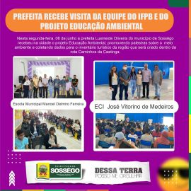 Nesta segunda-feira, 06 de junho a prefeita do município de Sossêgo recebeu na cidade o projeto Educação Ambiental, promovendo palestras sobre o meio ambiente e coletando dados para o inventário turístico da região que será criado dentro da rota Caminhos da Caatinga. Estiveram presentes a prefeita do município, Lusineide Oliveira, secretária de educação, Raquel Meira, coordenadores e professores da rede municipal de educação e agricultores. Além da participação do deputado estadual que é o idealizador do projeto caminhos da caatinga. Foi um dia de muito aprendizado, a equipe técnica do IFPB promoveu palestras sobre Educação ambiental e coletou informações pra o inventário Turístico do município.
