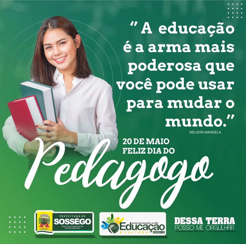 20 de maio, data celebrada anualmente, homenageia os profissionais responsáveis por ajudar na educação, formação e aconselhamento de crianças e adolescentes. Nesta data tão especial, parabenizamos a todos os pedagogos de nosso município. Que Deus continue abençoando o trabalho de todos vocês.
