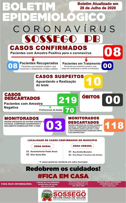 SOSSEGO Segue com 8 casos positivos, porém todos CURADOS.