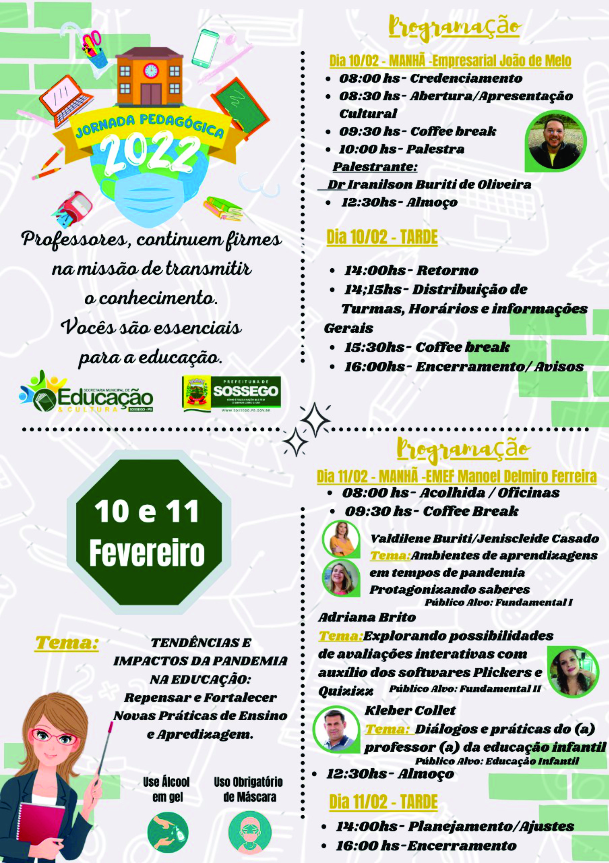 Nesta quinta feira e sexta feira, 10 e 11/02, os professores da rede municipal de ensino do municipio Sossêgo-PB participaram da JORNADA pedagógica, com o tema: TENDÊNCIAS E IMPACTOS DA PANDEMIA NA EDUCAÇÃO, Repensar e Fortalecer Novas Praticas de Ensino e Aprendizagem. Evento realizado no auditório do empresarial João de Melo.