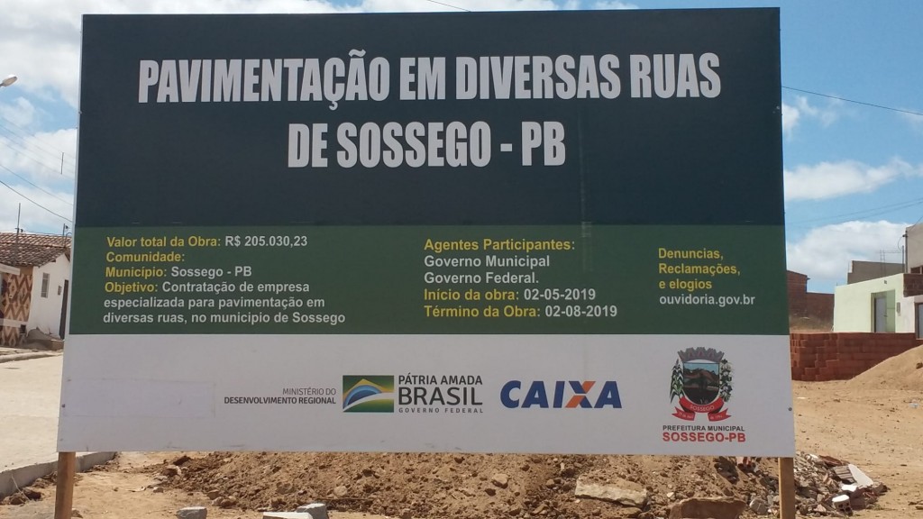 A prefeitura de Sossêgo, através da Secretaria de Administração, que tem como titular o Senhor Luís Gilmar Oliveira Lima está prestes concluir mais um trecho de pavimentação em paralelepípedos da Rua Horácio Ferreira, no Alto da Bela Vista e na próxima semana terá início às obras em outras ruas que também receberão calçamento. As vias que serão caladas são: Rua Joaquim Sabino Sobrinho; Rua Marcos Alberto de Oliveira, ambas também no Alto da Bela Vista e a Rua Antônio Ferreira de Macedo no entorno do centro, conhecida por Quadra São Jorge. Os recursos são frutos de parceria governo federal e município através de emedas parlamentar da ordem de R$ 205.030,23.