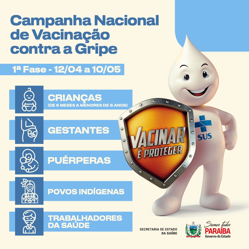 A Secretaria Municipal de Saúde começa hoje a fase da Campanha Nacional Contra Influenza seguindo o plano nacional dos grupos prioritários dessa primeira fase Profissionais da Saúde, Gestantes, Puerperas e crianças de 6 meses até 5 anos, 11 meses e 29 dias.