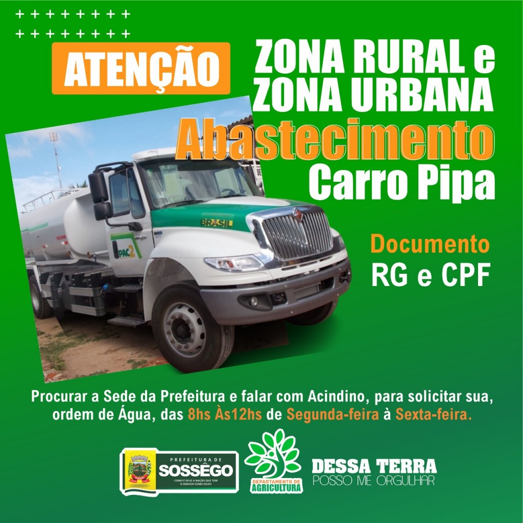 A Prefeitura de Sossêgo, através do Departamento de Agricultura, vem beneficiando a população local com o abastecimento d’água por meio de carros-pipa.